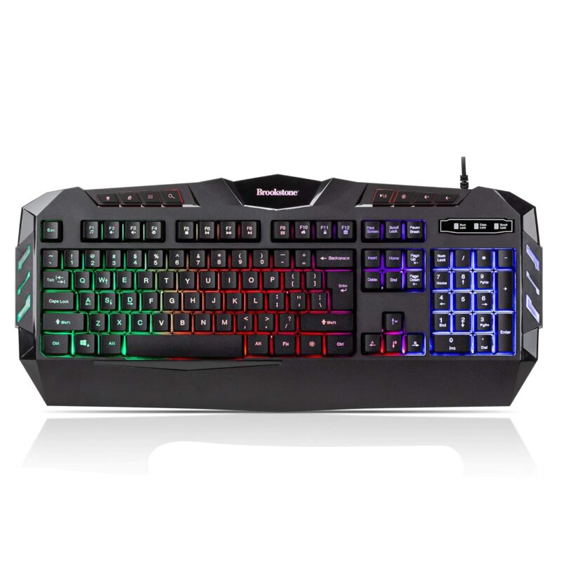 Brookstone USB Wired Gaming Keyboard with Multi-Color LED Backlit Keys and Numeric Keypad, Mac and PC Compatible (w/Palm Rest)